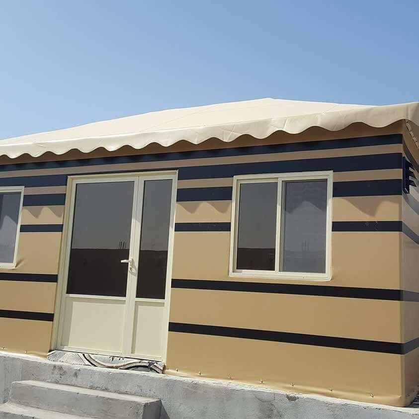 - تركيب القماش: بعد تثبيت الهيكل، يتم تركيب القماش أو الأقمشة المناسبة للخيمة.